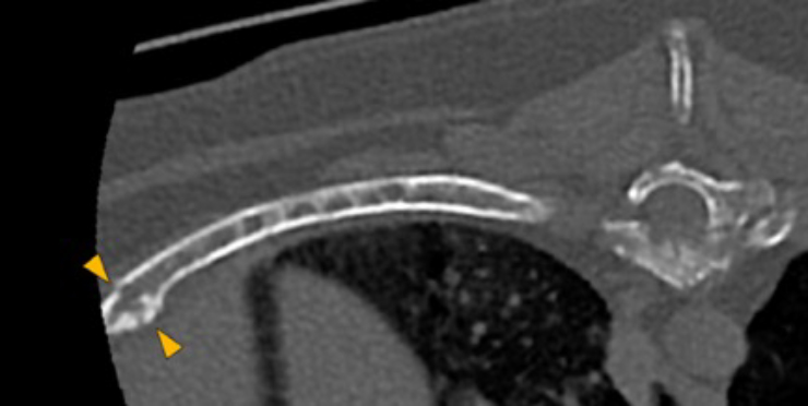 There are multiple osteolytic lesions with the same characteristics affecting both scapula and the pelvic bones included (pink and blue arrows respectively). There are osteolytic lesions with the same characteristics affecting multiple ribs. Associated with these lesions, there are multiple rib fractures.